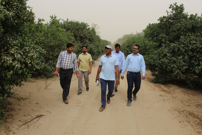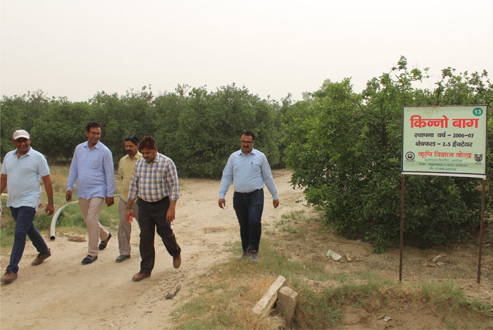 KVK, sangaria establishes a kinnow orchard in 2.5 hac. land area in 2006-2007. We grow 912 plants of kinnow with the spacing of 6*4 meter and irrigated with drip irrigation system. After 5 year of plantation Kinnow has started bearing. Now 12 year orchard gave average yield of 300 qtls/hac. per year 2.5 Lakh net profit. Irrigation with drip system causes a good quality of fruit.
